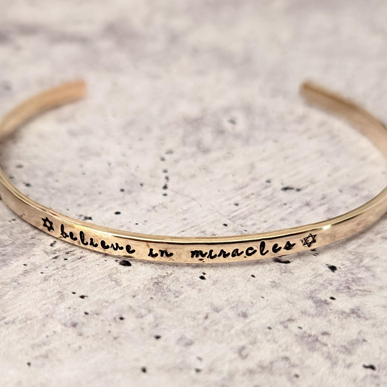 Celebrate Chanukah with a touch of magic! The Believe in Miracles Skinny Cuff Bracelet is a delicate, handmade piece that lets you show your Jewish pride with style. Perfect worn alone or stacked with your favorite bracelets, each cuff is hand-stamped, making every piece uniquely yours.
